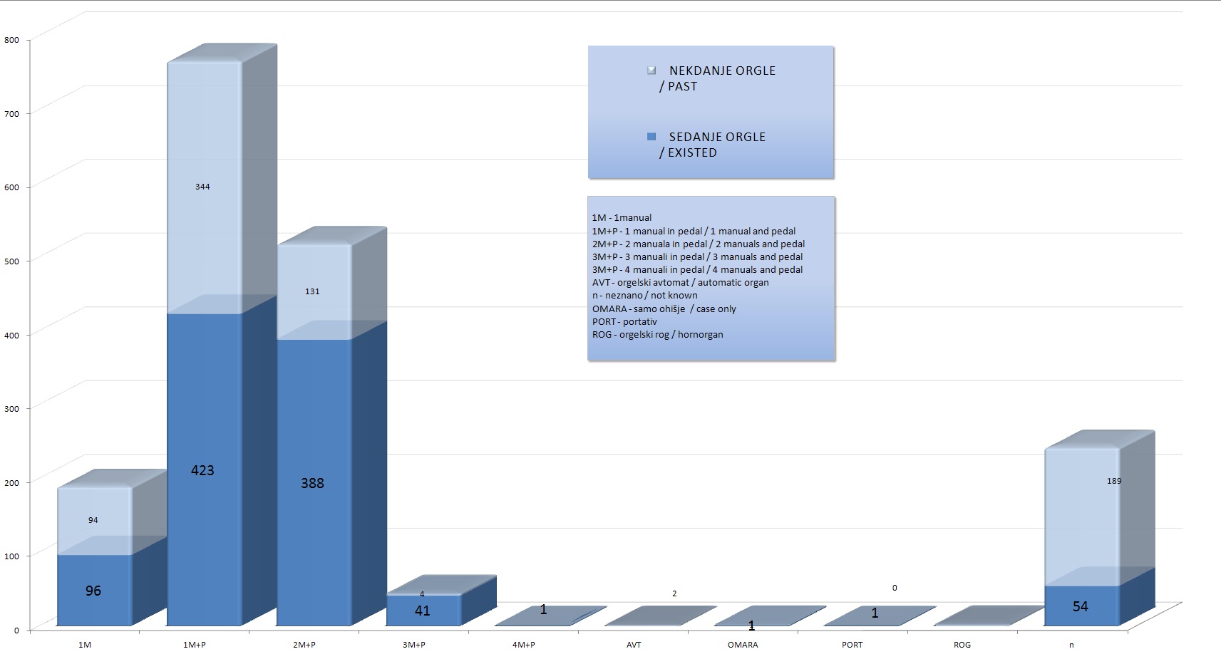 Razpredelnica: Pregled stanja podatkov. Za štetje obstoječih orgel na Slovenskem upoštevamo zgornje 4 kategorije. Glede na zbrane podatke je teh 1011.